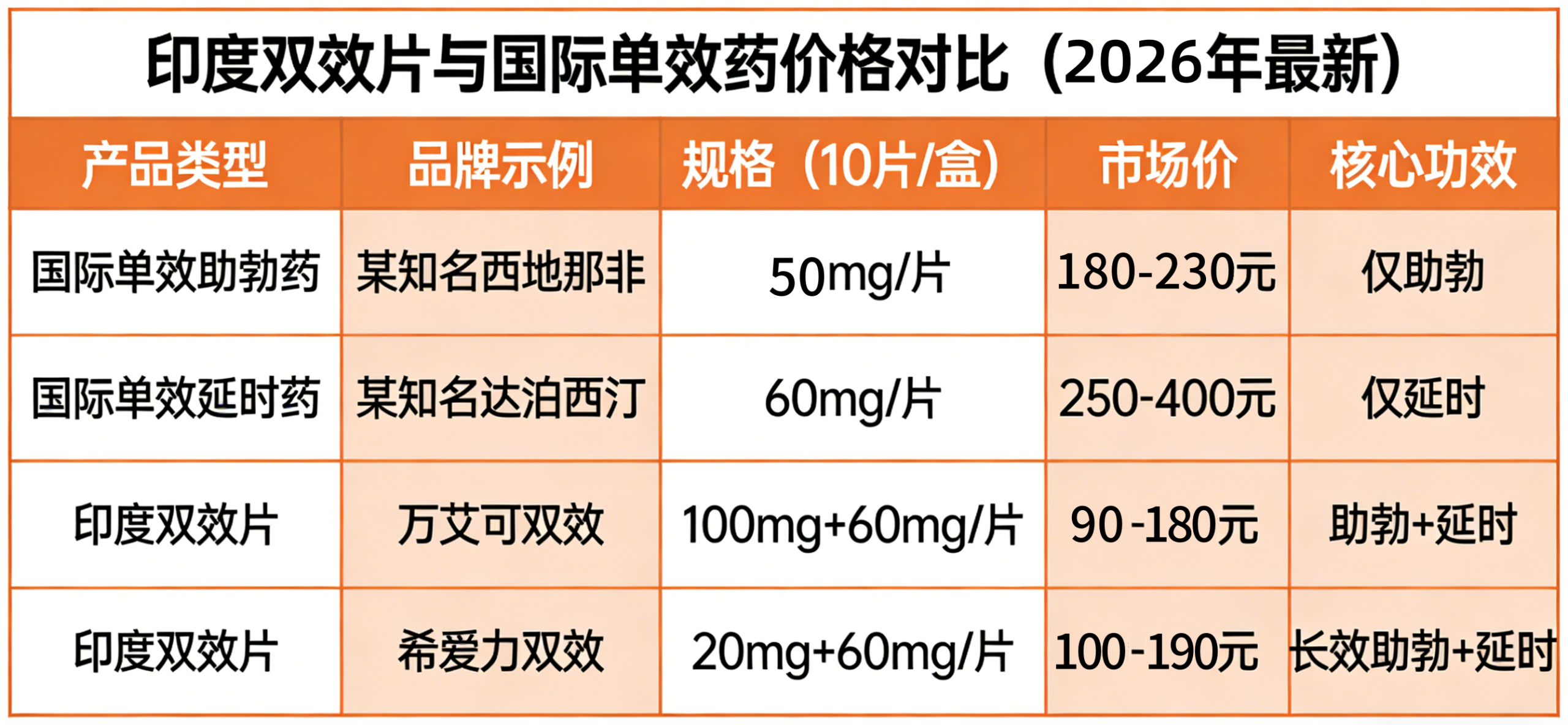 百度搜索 “印度双效片价格” 的用户,核心诉求都是 “高性价比”—— 对比国际品牌单效药,印度双效片的价格优势堪称 “降维打击”,以下是真实市场价格参考(2026年最新):